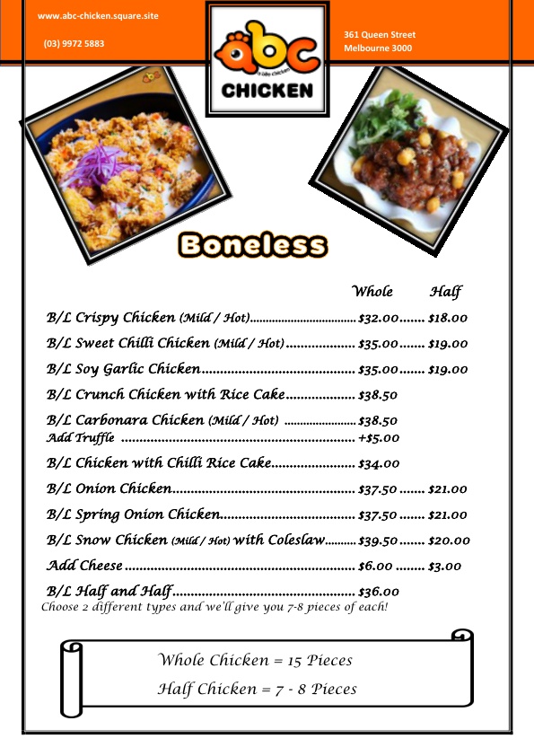Introducing ABC Chicken, a delightful culinary spot located in the vibrant heart of Melbourne at 361 Queen Street. This restaurant specializes in a range of chicken dishes, both standard and unique, ensuring something for every palate. The menu features highlights such as the Soy & Garlic Chicken, known for its bold garlic flavor, and Kimchi Soup, perfect for warming winter nights.